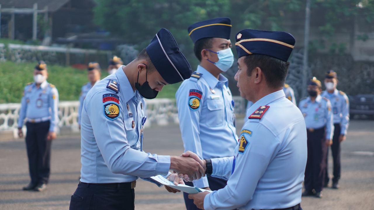 SIBERINDO.CO- Kepala Lembaga Pemasyarakatan Kelas IIA Cilegon, Sudirman Jaya memberikan penghargaan kepada Pegawai Teladan Periode bulan Juni dan Juli 2022 pada kegiatan Apel Pagi Pegawai yang digelar di Lapangan Apel, Senin (08/08).