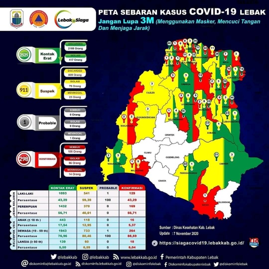 Siberindo.co – Di Kabupaten Lebak sebanyak 188 orang yang terkonfirmasi Covid-19 dinyatakan sembuh. Info tersebut disampaikan Pemerintah Kabupaten (Pemkab) Lebak melalui peta sebaran yang dikeluarkan Dinas Kesehatan setempat per tanggal 07 November 2020.