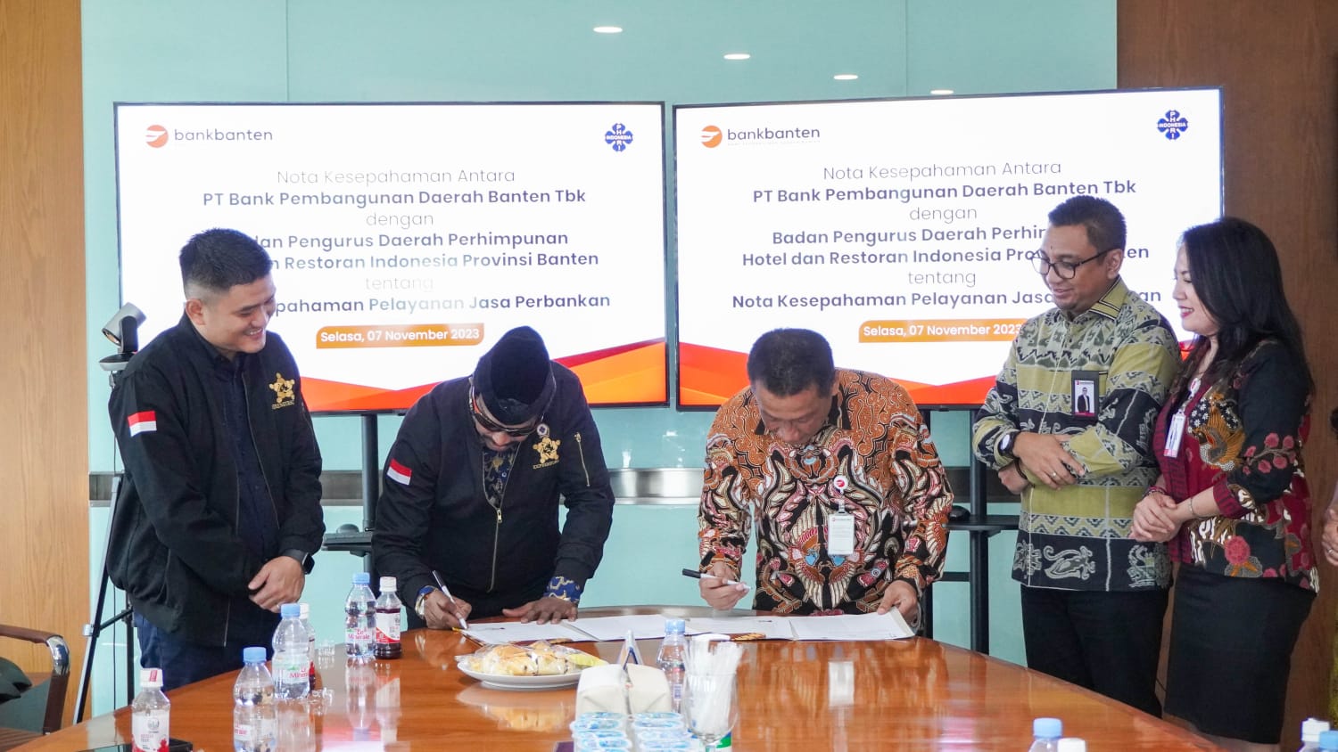 Penandatanganan yang dilakukan oleh Ketua PHRI Provinsi Banten, Bapak Ashok Kumar dan Direktur Bisnis Bank Banten, Bapak Rodi Judo Dahono, disaksikan Kepala Divisi Dana Jasa dan Treasury Bank Banten, Bapak Ferdy Ardian, serta dihadiri juga oleh Ketua PHRI Kabupaten Kota se-Banten dan para pengusaha Hotel dan Restoran.