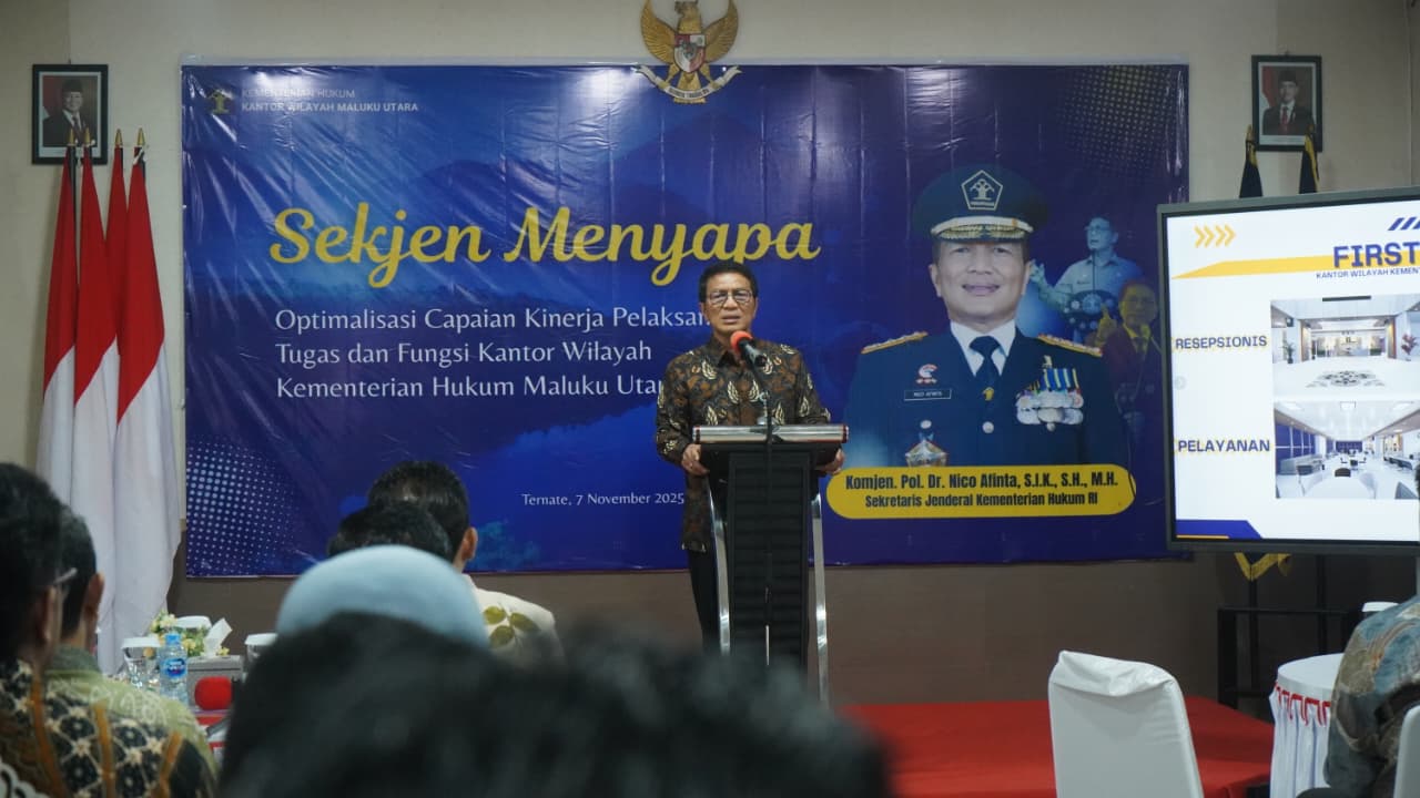 Selanjutnya, Sekjen Nico dalam arahannya mengingatkan kepada jajaran Kemenkum Malut agar dapat mengoptimalkan pelayanan hukum bagi masyarakat. Hal tersebut merupakan upaya membantu Menteri Hukum, Supratman Andi Agtas dalam akselerasi implementasi Asta Cita Presiden RI, Prabowo Subianto, guna mendukung pembangunan yang berdampak bagi masyarakat melalui peran Kemenkum.