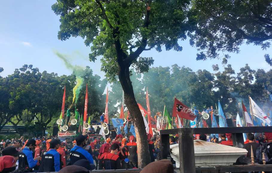Jakarta – Massa buruh dari Konfederasi Serikat Pekerja Seluruh Indonesia (KSPSI) AGN DKI Jakarta dan Serikat Pekerja Nasional (SPN) DKI Jakarta serta aliansi buruh lainnya melakukan demonstrasi di depan Kantor Balai Kota DKI Jakarta, Jalan Medan Merdeka Barat pada Rabu (8/12/2021). Mereka menuntut Gubernur DKI Jakarta Anies Baswedan segera merevisi upah minimum provinsi (UMP) DKI Tahun 2022.