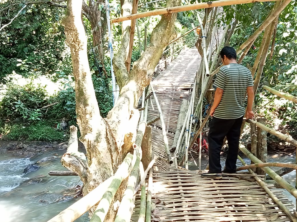 “Karena rusaknya jembatan tersebut rusak akibat diguyur hujan empat hari yang lalu, sehingga ketika anak-anak santri yang ingin mengaji ke Ponpes Tahfizd Quran Almapus harus bergelantungan, bahkan ada juga yang harus memutar dengan jarak yang lebih jauh lagi,” katanya.