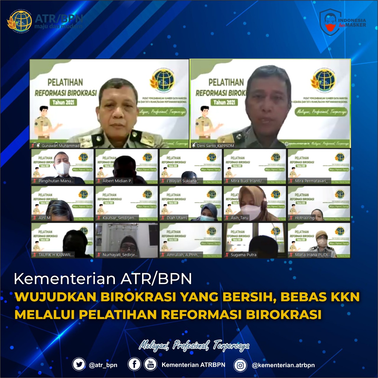 Oleh karena itu, Kementerian ATR/BPN melalui Pusat Pengembangan Sumber Daya Manusia (PPSDM) melaksanakan pelatihan Reformasi Birokrasi tahun 2021 melalui pertemuan daring, Senin (07/06/2021).