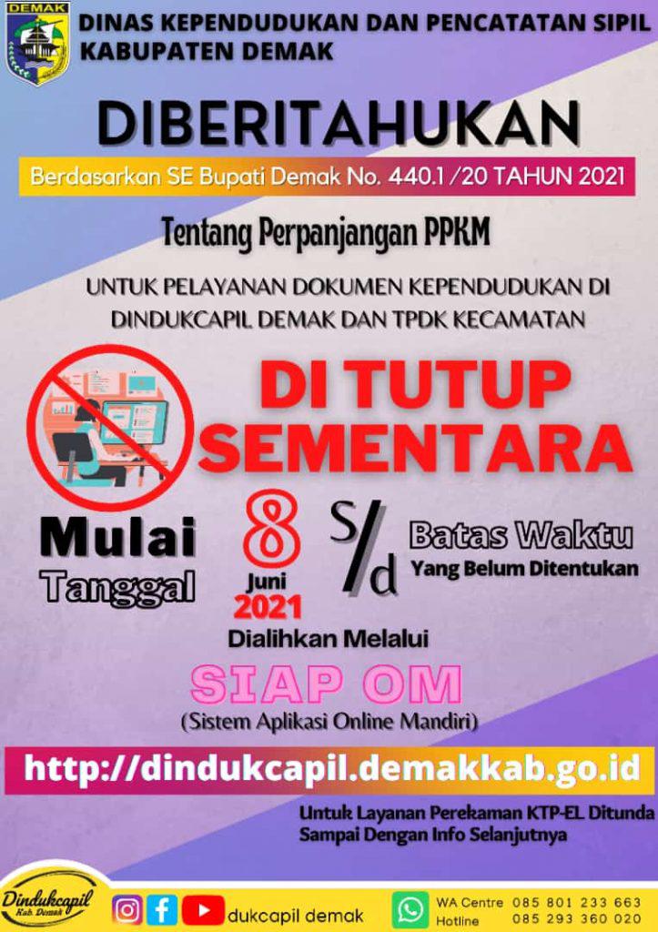 Pelaksana Tugas (Plt) Dindukcapil Kabupaten Demak Eni Susiani menyampaikan, pihaknya mengambil keputusan tersebut mengingat penyebaran kasus Covid-19 di Kabupaten Demak semakin tinggi. Selain itu, juga berdasarkan SE Bupati Demak Nomor 440.1/20 Tahun 2021 terkait perpanjangan Pemberlakuan Pembatasan Kegiatan Masyarakat (PPKM).