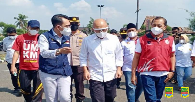 CIKARANG UTARA – Pj. Bupati Bekasi Dani Ramdan, mendampingi Menteri Koperasi dan Usaha Kecil dan Menengah (UKM) Teten Masduki, meninjau Vaksinasi Merah Putih, yang berlangsung di Halaman Lottemart Cikarang Utara, Minggu (8/8) pagi.