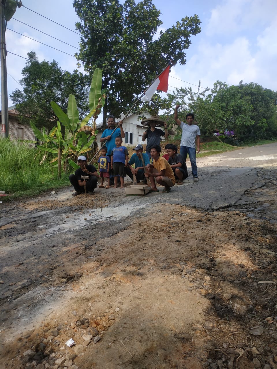 Warga kampung cimules desa bojongmenteng kecamatan lewidamar kabupaten lebak mlmengadakan kerjabakti menambal jalan yang berlubang, akibat sudah lama dibiarkan rusak parah, selasa (09/08/2022).