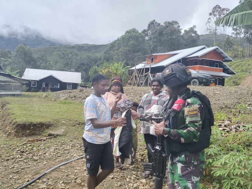 Meningkatkan kepedulian dan kedekatan terhadap masyarakat, Pos Ilu Satgas Pamtas Kewilayahan Yonif 753/AVT laksanakan membagikan pakaian di wilayah Distrik Ilu, Kab. Puncak Jaya, Minggu (8/9/2024).