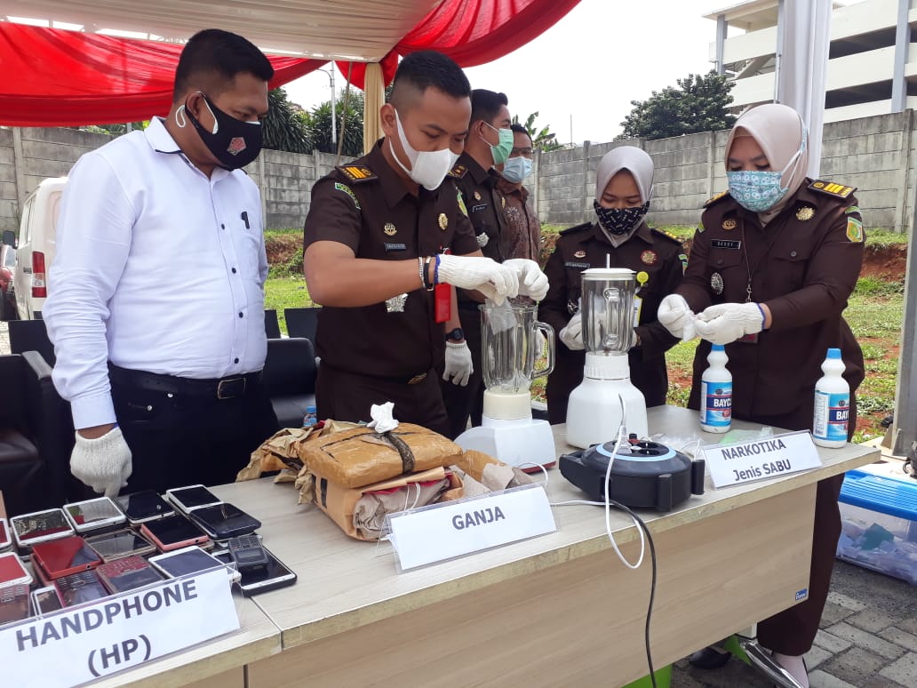 TANGERANG SELATAN- Kejaksaan Negeri (Kejari) Kota Tangerang Selatan (Tangsel) melakukan pemusnahan barang bukti perkara tindak pidana umum (Pidum) di Halaman belakang Gedung Kejari Tangsel, Jalan Prometer, Serpong, Senin (9/11/2020).
