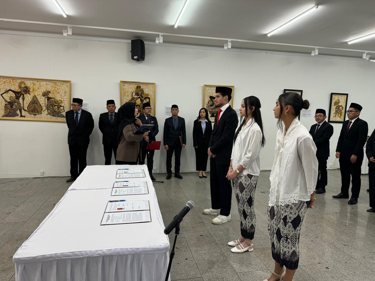 Kementerian Hukum (Kemenhum) Republik Indonesia melakukan sumpah kewarganegaraan terhadap 3 orang pemain sepakbola keturunan di Kedutaan Besar Republik Indonesia di Copenhagen, Denmark, Jumat (8/112024). Mereka yang disumpah antara lain, Kevin Dick, Estella Raquel Loupattij dan Noa Johanna Christina Cornelia Leatomu.