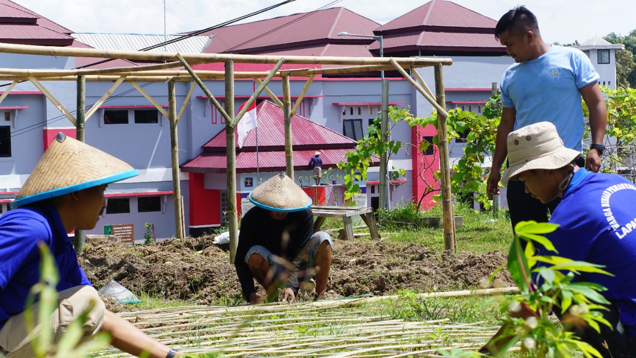 Sebagiannya lagi, sibuk merajut bilah bambu untuk didirikan kokoh, agar bisa menopang tanaman labu siam yang merambat. Setelah melakukan proses penanaman, seluruh warga binaan ini akan melakukan perawatan hingga labu siam siap dipanen.