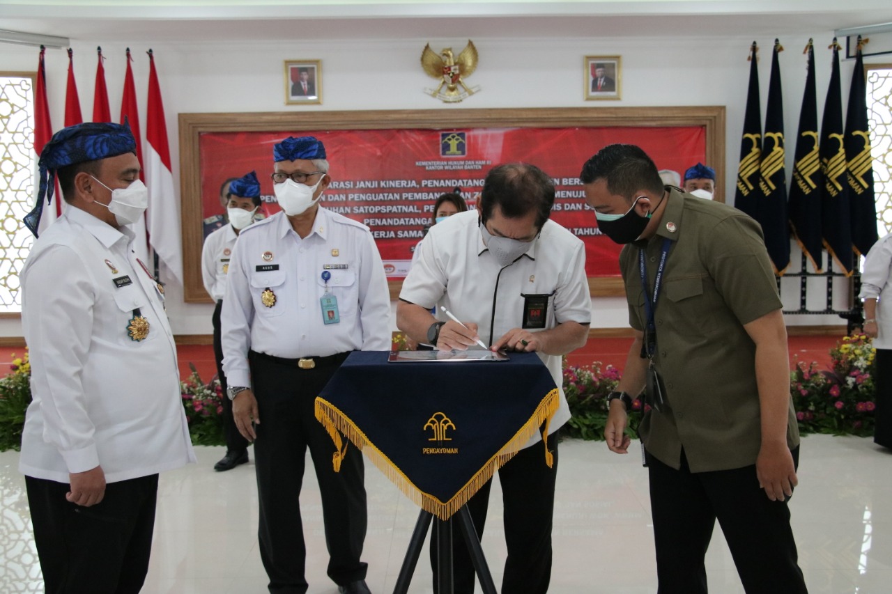 SIBERINDO.CO – Kantor Wilayah Kementerian Hukum dan HAM Banten melakukan Penandatanganan Komitmen Bersama Deklarasi Janji Kinerja, Pembangunan Zona Integritas (ZI) Wilayah Bebas Korupsi (WBK) dan Wilayah Birokrasi Bersih Melayani (WBBM), adapun penandatanganan terkait Nota Kesepahaman serta Perjanjian Kerja Sama dengan Pemerintah Provinsi Banten, Polda Banten, BNNP Banten, Korem 064/MY, PWI Banten, Kejati Banten, Pengadilan Tinggi Banten, Ombudsman RI Perwakilan Banten, Deputi Koordinasi dan Supervisi KPK, DPRD Banten, Pemerintah Kota Serang, serta Rektor UMT di lantai 3 Kanwil Kemenkumham Banten, yang disaksikan langsung oleh Plt. Sekretaris Jenderal Kemenkumham RI, Komjen Pol. Andap Budhi Revianto. Rabu (10/02).