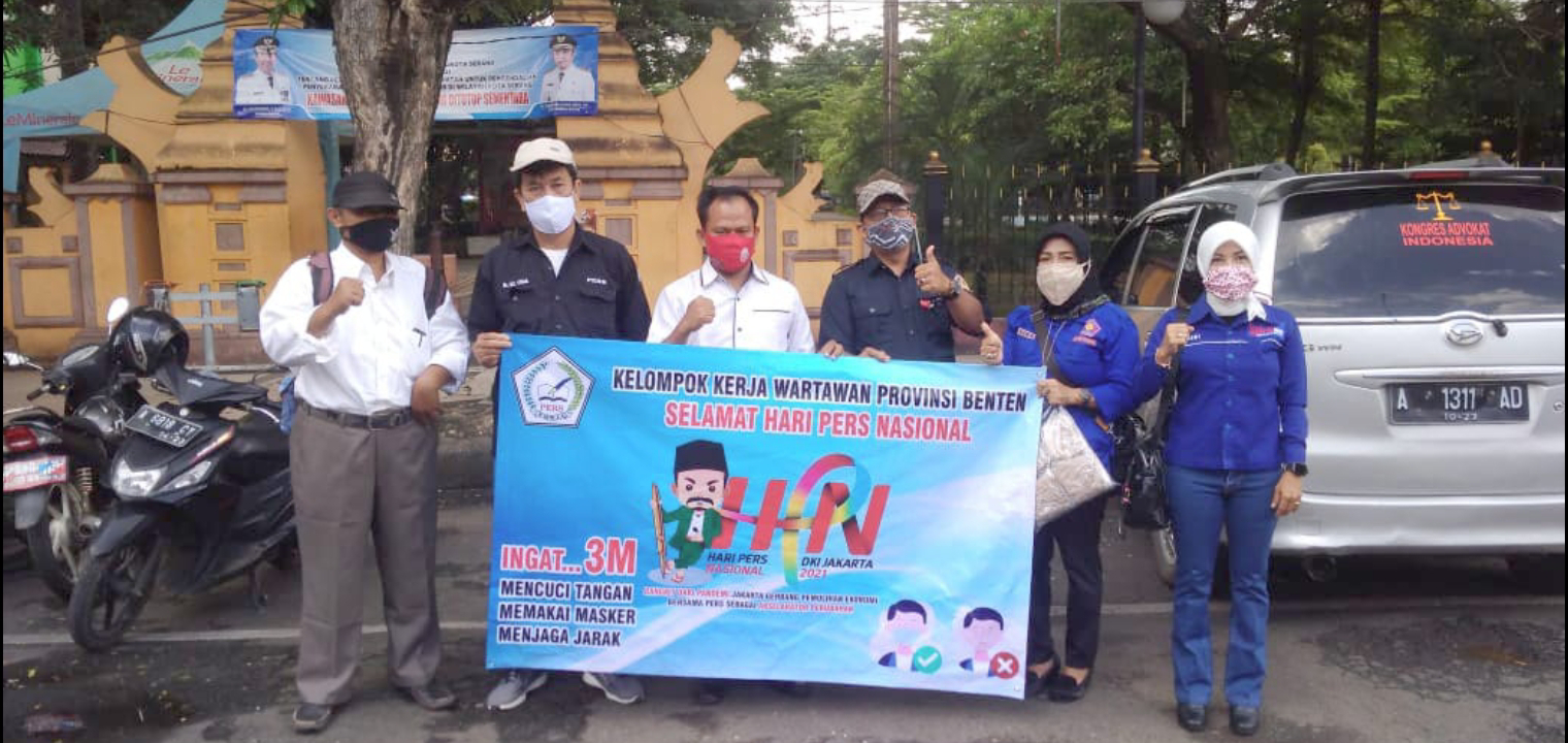 SERANG – Peringati Hari Pers Nasional (HPN) 2021 Kelompok Kerja (POKJA) Wartawan Provinsi Banten Gelar Bakti Sosial di tiga titik secara bersamaan sedangkan satu titik akan dilaksanakan besok, para pewarta ini melakukan bakti sosial dengan membagikan Masker secara Roadshow. Kegiatan ini merupakan dukungan insan pers, untuk memenuhi kebutuhan masyarakat di tengah merebaknya wabah Covid-19.
