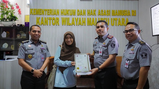Saat penyerahan kepada Murniati Jufri, Kakanwil Budi Argap Situngkir didampingi Kepala Divisi (Kadiv) Pelayanan Hukum, Chusni Tamrin, dan Kepala Bidang (Kabid) Administrasi Hukum Umum, M. Kasim Umasangadji.