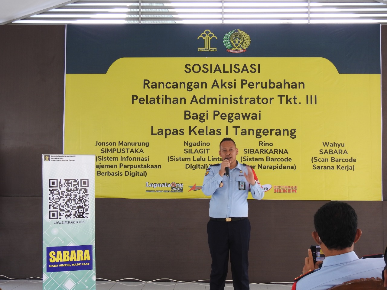 Lembaga Pemasyarakatan Kelas I Tangerang memperkenalkan sebuah inovasi berbasis IT dengan nama “SABARA” yaitu Scan Barcode Sarana Kerja, lebih lanjut d jelaskan Kabid Giatja bahwasannya tujuan diciptakannya Sabara adalah untuk memudahkan petugas dalam melakukan pengecekan terhadap sarana prasarana yang ada di tiap-tiap bengkel kerja atau ruang ketrampilan.