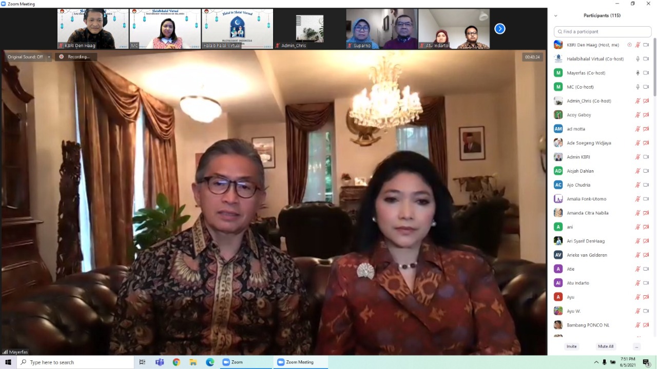 Menyikapi kondisi ini, KBRI Den Haag menyelenggarakan halalbihalal virtual Masyarakat Indonesia di Belanda pada Sabtu, (5 Juni 2021). Kegiatan dibuka oleh Dubes RI Den Haag, Mayerfas dengan menyampaikan pesan untuk tetap menjaga semangat persatuan dan kekeluargaan. Tidak lupa, ia berpesan untuk senantiasa mengikuti protokol kesehatan setempat serta menjaga kesehatan baik diri sendiri maupun orang lain.