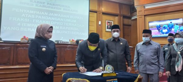 Pemerintah Kabupaten (Pemkab) Serang menggelar Rapat Paripurna dengan agenda penyampaian jawaban Bupati Serang atas pandangan umum fraksi-fraksi DPRD terhadap empat Raperda Usulan Bupati Serang. Rapat tersebut digelar pada Rabu (9/6/2021) di Gedung DPRD Kabupaten Serang.