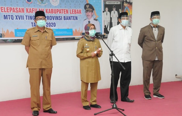 LEBAK – Bupati Lebak Iti Octavia Jayabaya melepas langsung Peserta Musabaqoh Tilawatil Qur’an (MTQ) Ke XVII Kontingen Lebak Tingkat Provinsi Banten, bertempat di Pendopo Bupati Lebak, Senin (10/08/2020) Pasalnya kafilahMTQ Lebak tersebut sebanyak 57 peserta akan mengikuti 9 cabang yang terdiri dari 25 golongan.