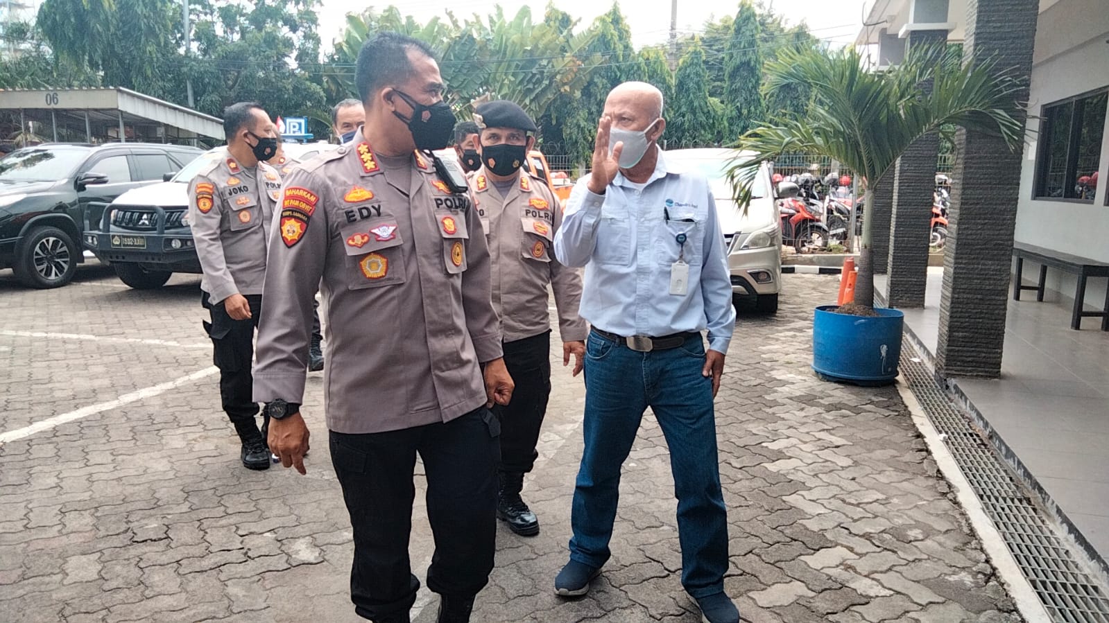 Kedatangan Dirpamobvit Polda Banten Kombes Pol Edy Sumardi disambut langsung oleh General Manager PT Chandra Asri Petrochemical Bapak Salikim dan didampingi Manager Security Bapak Sugeng dan Chief Security Bapak Mardi.