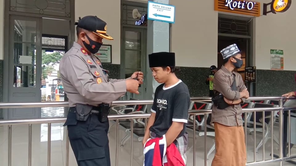 SERANG – Personel Polsek Serang Polres Serang Kota Polda Banten melaksanakan pembagian masker di Stasiun Kereta Api Kota Serang Kamis (10/09/2020).
