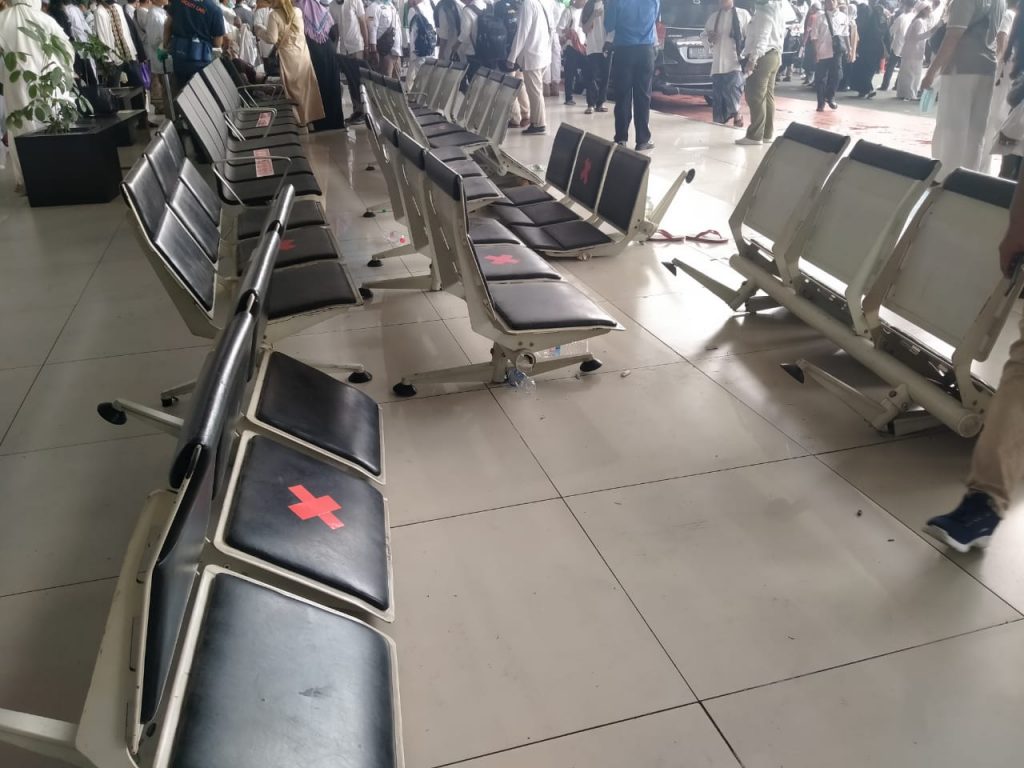 Tampak sejumlah tanaman hias di Bandara Soetta terinjak-injak oleh masa yang berkerumun. Tidak sedikit bangku untuk pengguna jasa yang terbuat dari besi juga patah.