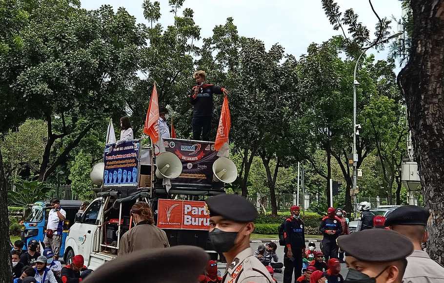 “Kalau 7-10 persen, kita akan menjadi Rp 4,8 juta karena kita harus imbangin juga,” ujar Ketua KSPI DKI Winarso saat demonstrasi di depan Balai Kota Jakarta, Rabu (10/11/2021).
