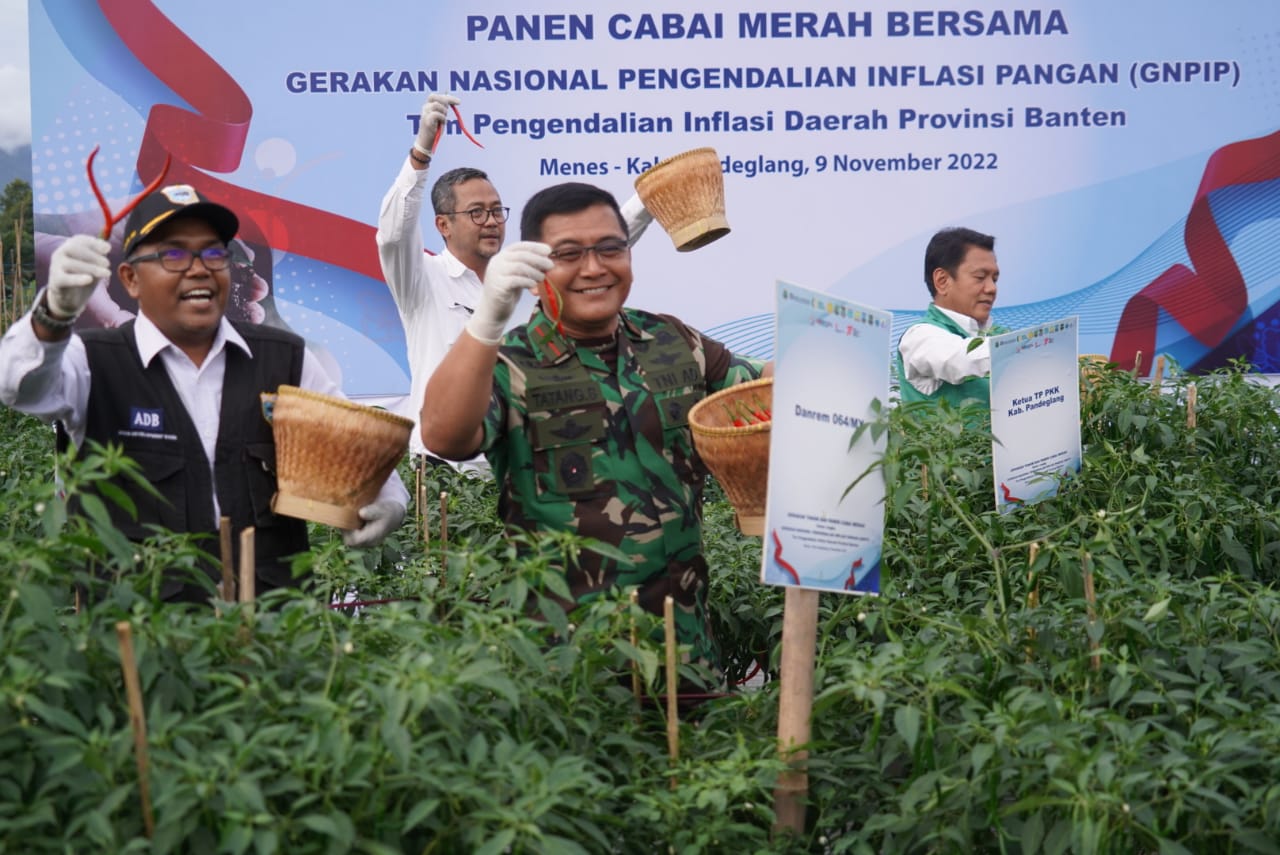 PANDEGLANG – Danrem 064/MY Brigjen TNI Tatang Subarna menghadiri Gerakan Nasional Pengendalian Inflasi Pangan (GNPIP) di Provinsi Banten dengan melakukan Gerakan Tanam dan Panen Cabai Merah Bersama yang berlangsung di Desa Kadu Kombong, Kecamatan Menes, Kabupaten Pandeglang, Rabu (9/11/2022).