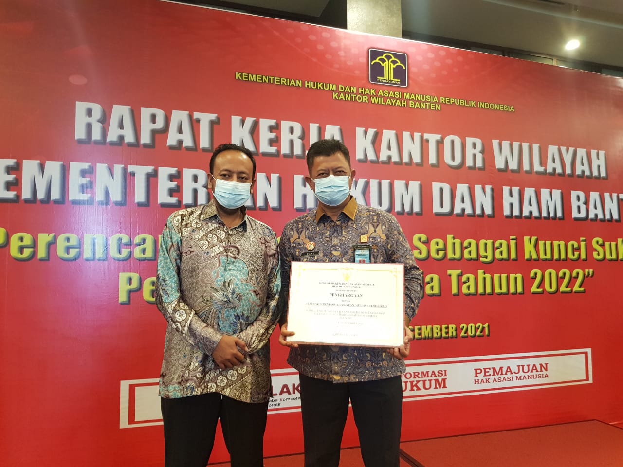 Piagam Penghargaan yang ditandatangani oleh Menteri Hukum dan HAM diserahkan langsung oleh Kepala Kantor Wilayah Kementerian Hukum dan HAM Banten, Agus Toyib.