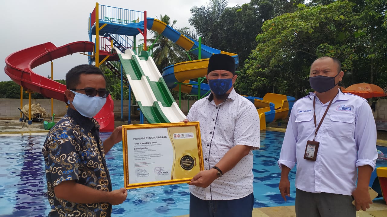 Pengelola Water Boom Cimenteng yang merupakan usaha andalan BUMDES Cimenteng Jaya, Badriyudin mewakili pengurus BUMDES menerima penghargaan tersebut untuk kategori Sahabat Pers.