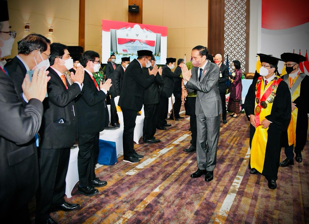 Presiden RI Joko Widodo (Jokowi) menghadiri Sidang Terbuka Senat Akademik Dies Natalis ke-46 Universitas Sebelas Maret (UNS) yang digelar di UNS Tower Ki Hadjar Dewantara, Kota Surakarta, Provinsi Jawa Tengah, Jumat (11/03/2022). Saat menyampaikan arahannya, Presiden terlebih dahulu mengucapkan selamat kepada keluarga besar UNS, sekaligus memberikan apresiasi atas kontribusinya pada kemajuan masyarakat.
