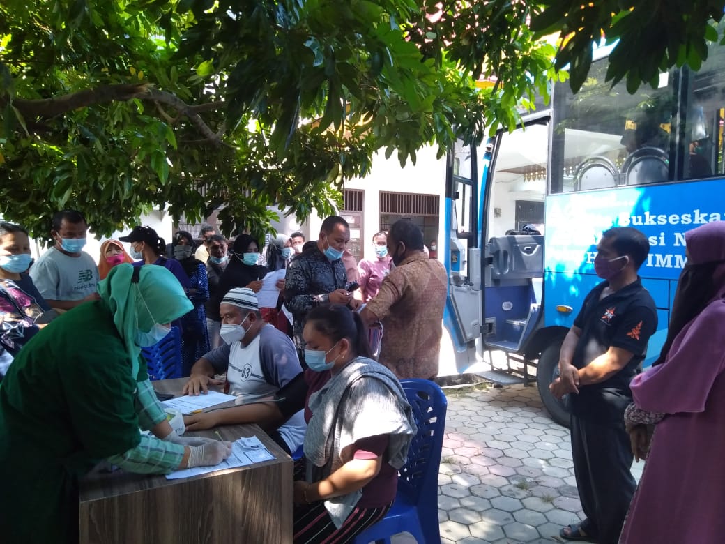 PEKANBARU – Dua bus vaksinasi keliling memberikan pelayanan suntik vaksin kepada 342 warga pada vaksinasi yang dipusatkan di halaman Markas Polisi Sektor (Mapolsek) Tenayan Raya dan kantor Lurah Mentangor, Kecamatan Kulim, Kamis (10/6).