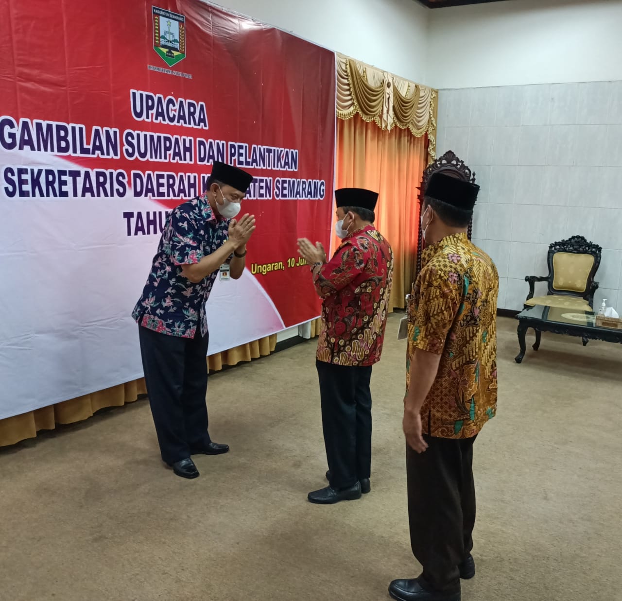 UNGARAN – Bupati Semarang Ngesti Nugraha kembali melantik Suko Mardiono sebagai Penjabat (Pj) Sekretaris Daerah Kabupaten Semarang, di Ruang Utama Rumah Dinas Bupati Semarang di Ungaran, Kamis (10/6/2021) siang. Pelantikan dilakukan  berdasarkan Keputusan Gubernur Jawa Tengah Nomor 821.2/341/2021 tentang penunjukan Penjabat Sekda Kabupaten Semarang.