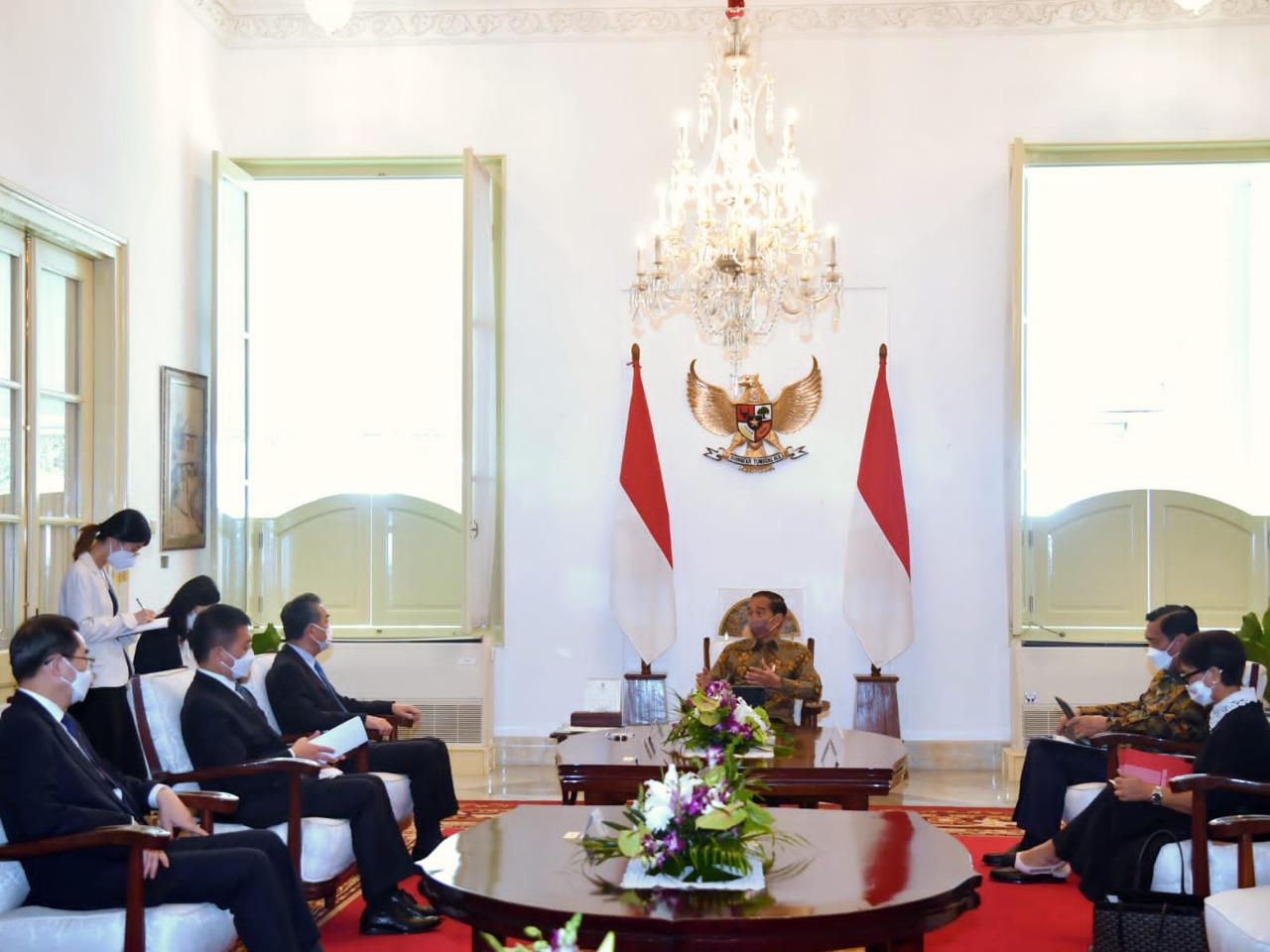 Dalam pertemuan tersebut, Presiden Jokowi turut didampingi oleh Menteri Koordinator Bidang Kemaritiman dan Investasi Luhut Binsar Pandjaitan. Sementara, Menteri Luar Negeri RRT Wang Yi didampingi oleh Duta Besar Luar Biasa dan Berkuasa Penuh Republik Rakyat Tiongkok untuk Republik Indonesia Lu Kang dan Assistant Minister Kementerian Luar Negeri Tiongkok Wu Jianghao. (Red).