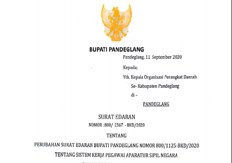 Untuk memutus mata rantai Covid-19 ini, Bupati Pandeglang telah mengeluarkan Surat Edaran Nomor 800/2367-BKD/2020 yang berisi tentang perubahan SE Nomor 800/ 1125-BKD/2020 tentang sistem kerja pegawai aparatur sipil negara (ASN) dalam tatanan normal baru di lingkup Pemkab Pandeglang. SE ini tertanggal 11 September 2020.