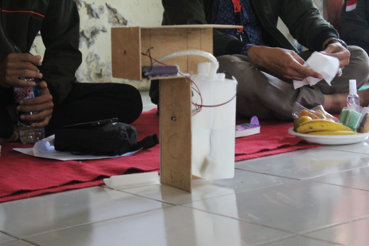 Kelompok 38 Kuliah Kerja mahasiswa (KKM) Universitas Serang Raya (UNSERA) membuat terobosan baru dengan menciptakan Handsanitizer otomatis di Kampung Pancuran, Desa Lebakwana, Kecamatan Kramatwatu, Serang Banten, Kamis 10 September 2020.