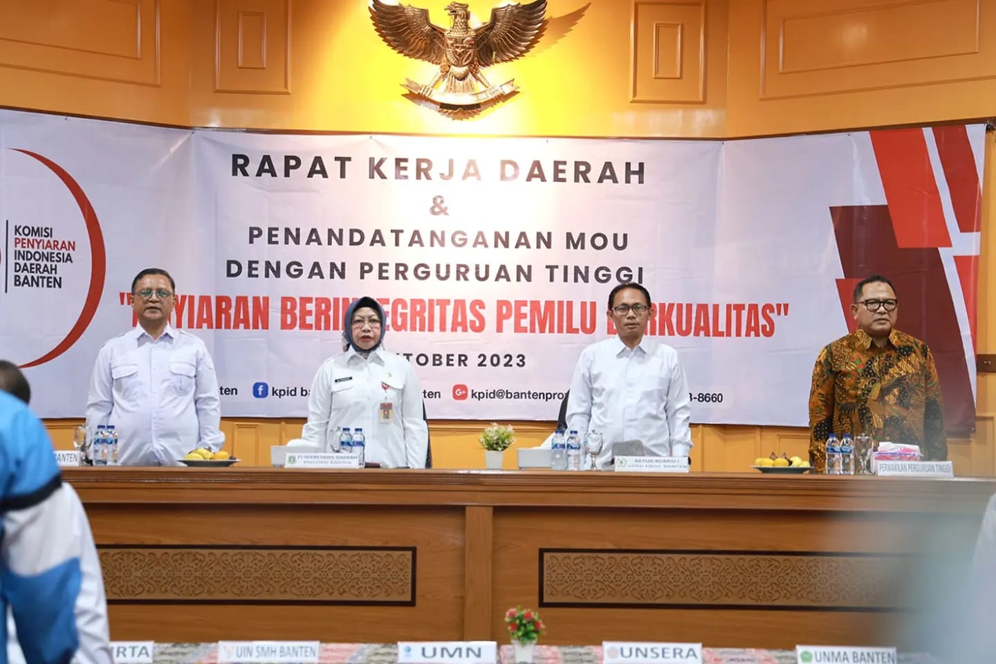 Hal itu diungkapkan Penjabat (Pj) Sekda Provinsi Banten Virgojanti saat acara Rapat Kerja Daerah dan Penandatanganan Memorandum of Understanding (MoU) dengan Perguruan Tinggi yang mengusung tema “Penyiaran Berintegritas Pemilu berkualitas” di Aula Bappeda, KP3B, Kota Serang, Rabu (11/10/2023).