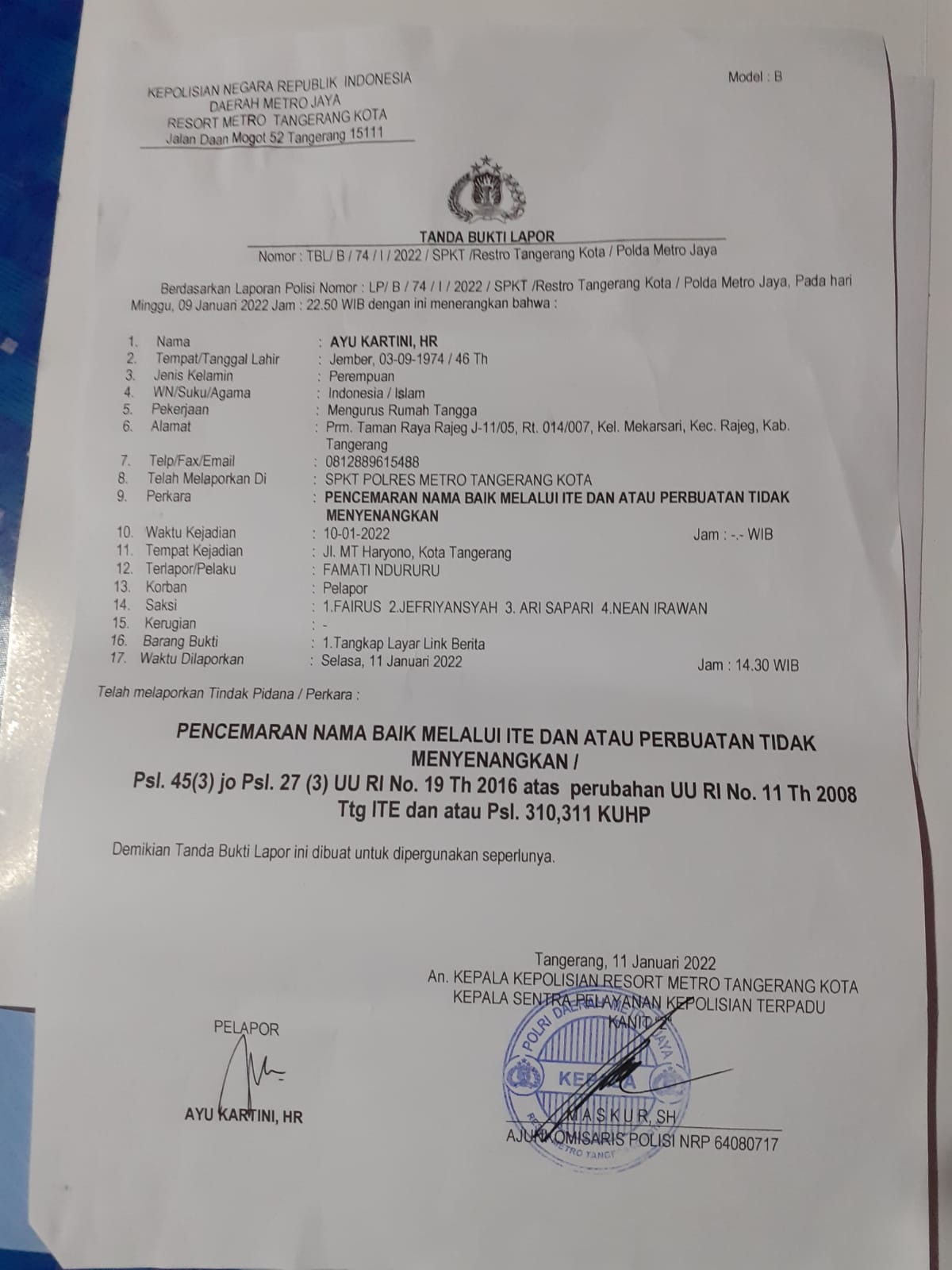 Selanjutnya dihari yang sama Ayu Kartini benar-benar membuktikan ucapannya. Dengan didampingi oleh seluruh anggota JTR dan SMSI Kota Tangerang, Ayu Kartini langsung melaporkan oknum wartawan Famati Ndururu dari Media Nawacita Post dengan pasal berlapis yaitu dugaan Pencemaran nama baik, UU ITE dan Perbuatan tak menyenangkan ke Polres Metro Kota Tangerang, Selasa (11/2/22).