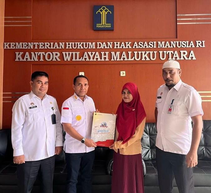 Ternate – Kantor Wilayah (Kanwil) Kementerian Hukum (Kemenkum) Maluku Utara (Malut) menyerahkan tiga dokumen apostille antara lain ijazah, transkrip nilai dan kartu keluarga sebagai pemenuhan syarat untuk melanjutkan program pendidikan S2, dengan negara tujuan Korea Selatan (Korsel).