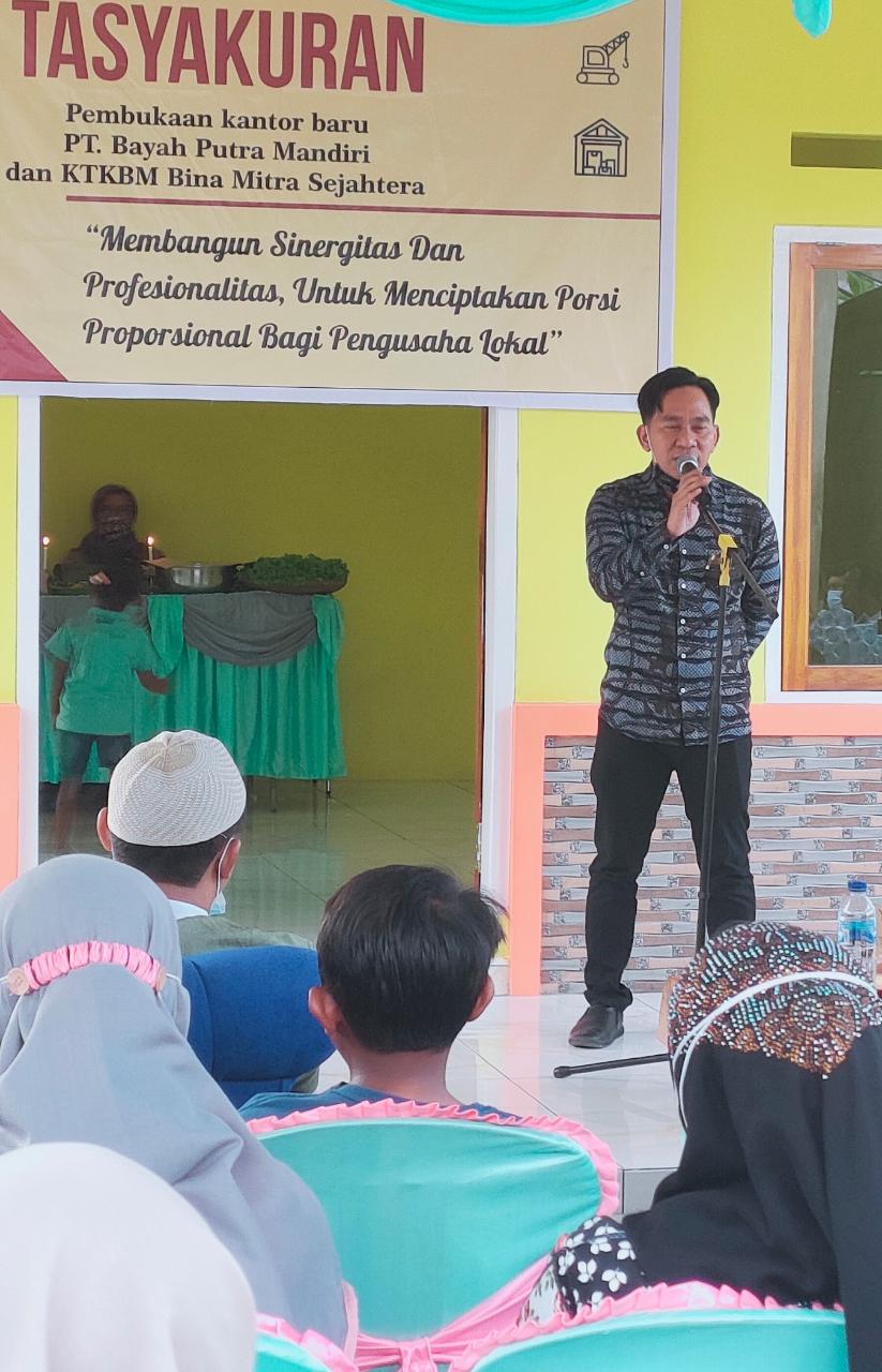 SIBERINDO.CO – PT Bayah Putra Mandiri (BPM) dan Koperasi Tenaga Kerja Bongkar Muat (KTKBM) Bina Mitra Sejahtera menggelar tasyakuran kantor baru yang berada di Kampung Bayah Tugu, Desa Bayah Barat, Kecamatan Bayah, Kabupaten Lebak, acara tersebut juga sekaligus melakukan santunan kepada anak yatim, Jum’at(12/3).