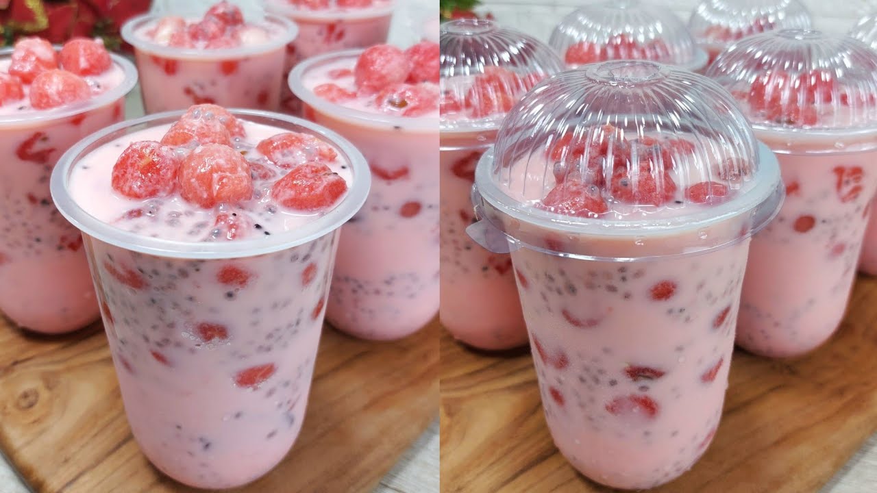 – Siapkan gelas atau mangkuk besar. Masukkan potongan semangka, nata de coco, dan biji selasih.