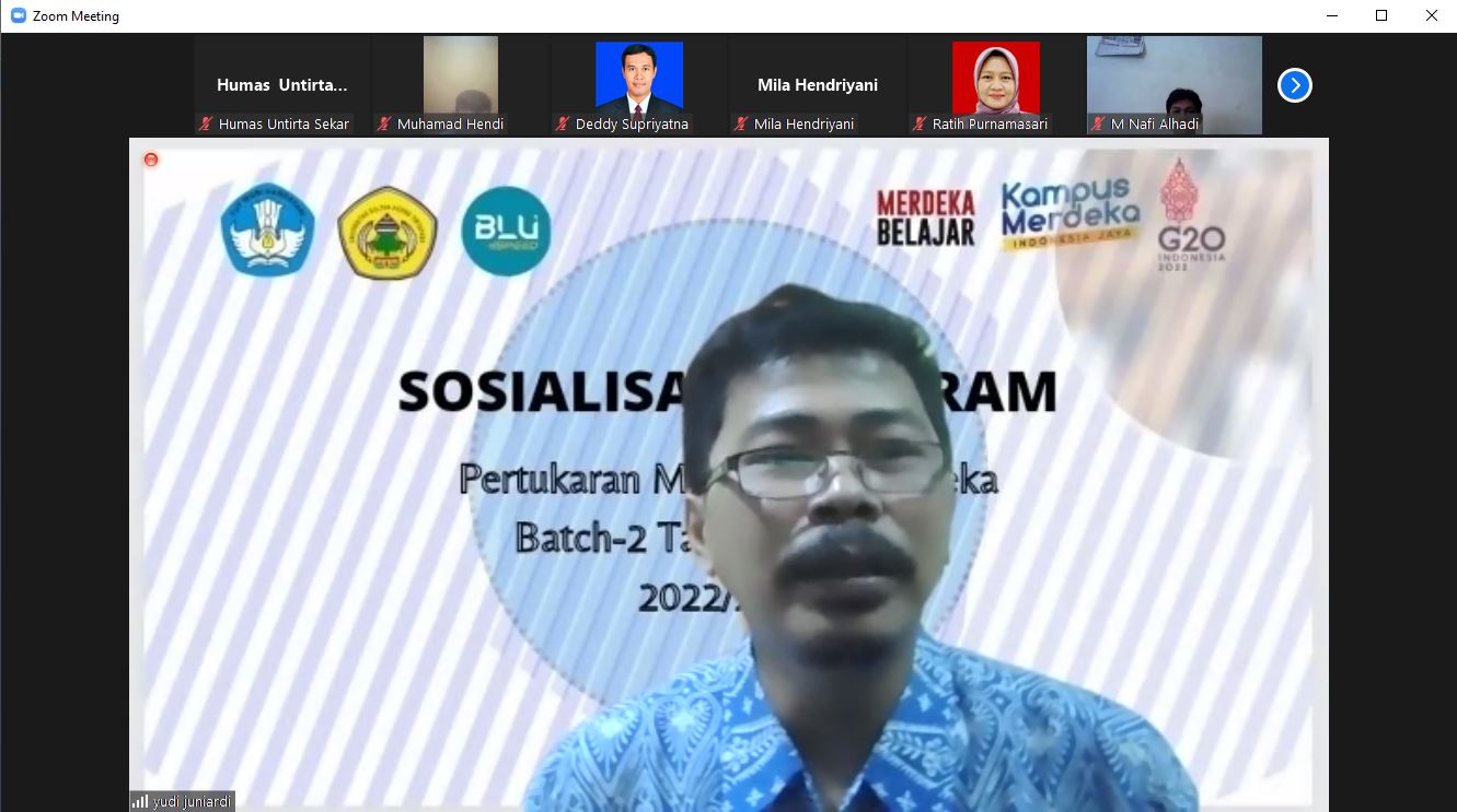 Ketentuan, persyaratan, dan timeline PMM disosialisasikan oleh Untirta kepada mahasiswa Fakultas Teknik Mesin secara daring melalui acara Sosialisasi Program Pertukaran Mahasiswa Merdeka Batch II Tahun Akademik 2022/2023 yang dilaksanakan pada Kamis, 12 Mei 2022 pukul 9 pagi. Acara yang dibuka oleh Ketua Jurusan PVTM Untirta, Sulaeman Deni Ramdani, M.Pd ini menghadirkan Dr. Yudi Juniardi, M.Pd selaku Koordinator Pertukaran Mahasiswa Merdeka Untirta sebagai pembicara.