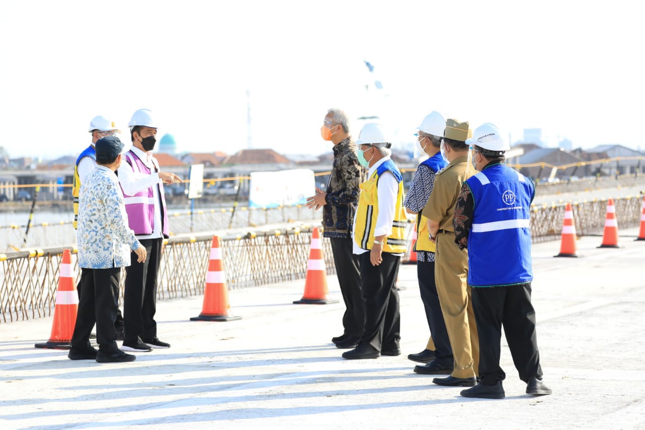 Bertolak dari Semarang, Jokowi didampingi Gubernur Jawa Tengah Ganjar Pranowo, Wakil Ketua DPRD Jateng, Bupati dan Wakil Bupati Demak serta sejumlah pejabat terkait melihat progres Jalan Tol Semarang-Demak, tepatnya di Seksi II Sayung-Demak.