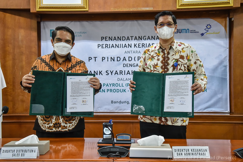 Direktur Keuangan dan Administrasi PT Pindad (Persero), Wildan Arief dan Direktur Distribution & Sales PT Bank Syariah Indonesia Tbk, Anton Sukarna menandatangani Perjanjian Kerjasama pada Jumat, 11 Juni 2021 berlokasi di Auditorium PT Pindad (Persero), Bandung. Perjanjian kerjasama mengenai layanan payroll (penggajian pegawai) serta penggunaan produk & layanan perbankan syariah. Pada kesempatan tersebut, Direktur Distribution & Sales PT Bank Syariah Indonesia Tbk didampingi oleh Regional CEO; Dade Darmawan, Group Head Institutional Banking 1; Ida Triana Widowati, Area Manager; Ficko Hardiwiseto, Dept. Head of State on Enterprise; A Dobig Mirandi, Branch Manager Bandung Antapani; M. Taqiyuddin dan Senior Relationship Manager; Invamilla Dewi. Penandatanganan kerjasama tersebut juga dihadiri dan disaksikan oleh Sekretaris Perusahaan PT Pindad (Persero); Krisna Cahyadianus dan VP HCM; Kaka Rohana.