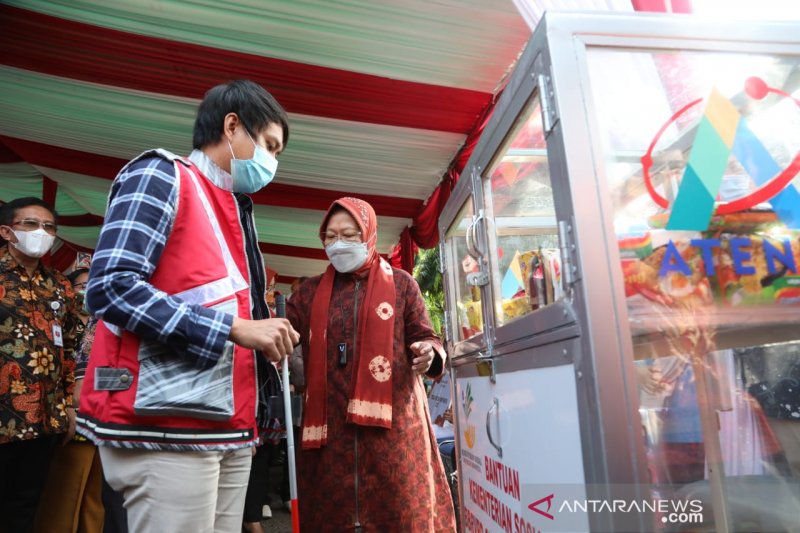 Jakarta – Menteri Sosial (Mensos) Tri Rismaharini membantu melelang sepatu hingga biskuit dagangan penyandang disabilitas yang dipamerkan di Sentra Kreasi Atensi Balai Rehabilitasi Sosial Disabilitas Mental Ciung Wanara Cibinong, Bogor, Jawa Barat, Sabtu.