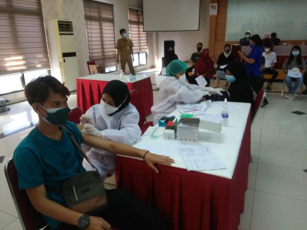 JAKARTA – Sebanyak 100 warga menikmati layanan vaksinasi mobil keliling di aula kantor Kecamatan Ciracas, Jakarta Timur, Senin (12/7). Layanan ini digelar hasil kerja sama pemprov dengan Kamar Dagang Industri (Kadin) DKI Jakarta.