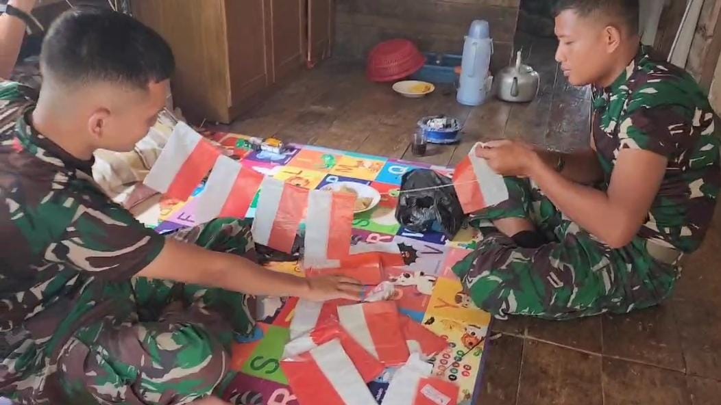 Seperti yang dilakukan oleh Serda yosep yang tergabung satgas TMMD ke 121 bersama rekan rekan saling bahu membahu membuat rangkaian bendera bendera yang nantinya dipasang di sepanjang jalan kampung Nanggorak, Senin (12/08/24)