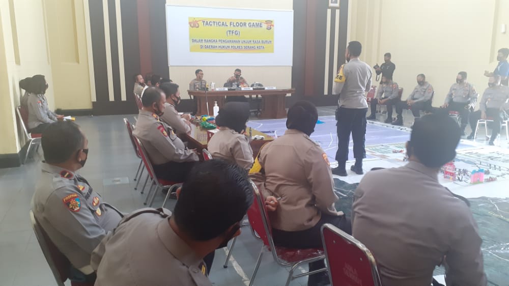 KOTA SERANG – Polres Serang Kota Polda Banten melaksanakan kegiatan Tactical Floor Game (TFG) atau biasa disebut gladi lapangan sistem Pengamanan di Aula Mapolres Serang Kota, Senin (12/10/2020).