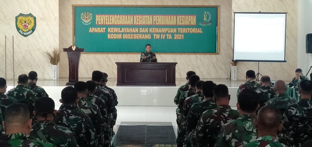 SERANG – Penyelenggaraan kegiatan Aparat Kewilayahan dan Kemampuan Teritorial Kodim 0602/Serang, dihadiri oleh seluruh perwakilan Babinsa Koramil jajaran Kodim 0692/Serang, Jumat, 12 November 2021.