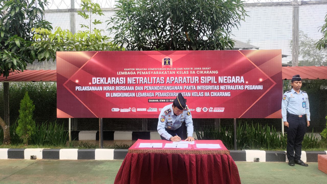 “Pagi ini kita sudah melaksanakan 2 rangkaian kegiatan, yang pertama kegiatan rutin apel pagi dan yang kedua melaksanakan Ikrar bersama dan Penandatanganan Pakta Integritas Netralitas Pegawai untuk persiapan Pemilihan Umum tahun 2024,” ujar Kalapas Cikarang Veri Johanes.