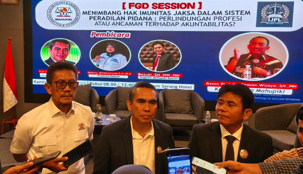 SERANG – Hak imunitas jaksa dalam sistem peradilan kembali menjadi sorotan dalam Focus Group Discussion (FGD) yang digelar oleh Masyarakat Hukum Pidana dan Kriminologi Indonesia (Mahupiki) bekerja sama dengan IJPL.