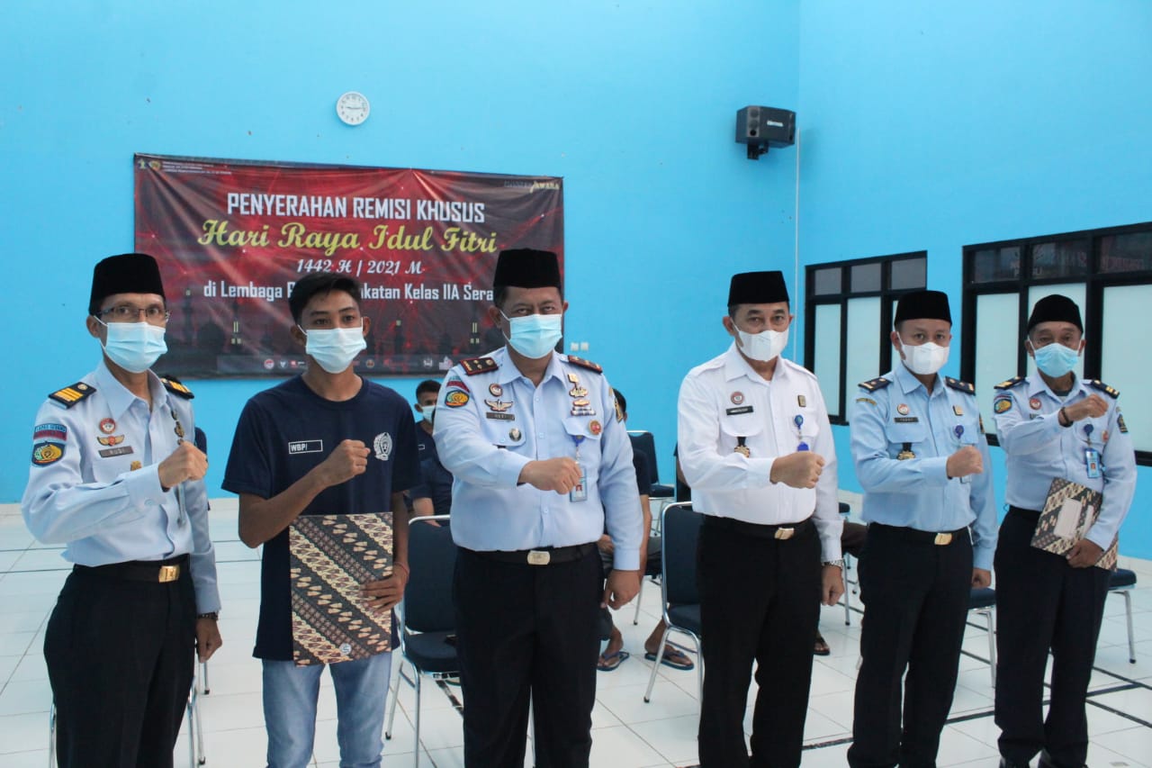 Kepala Lapas Kelas IIA Serang, Heri Kusrita menyerahkan Remisi Khusus Hari Raya Idul Fitri 1442 H secara simbolis kepada perwakilan Warga Binaan Lapas Serang yang mendapatkan Remisi Khusus Hari Raya.